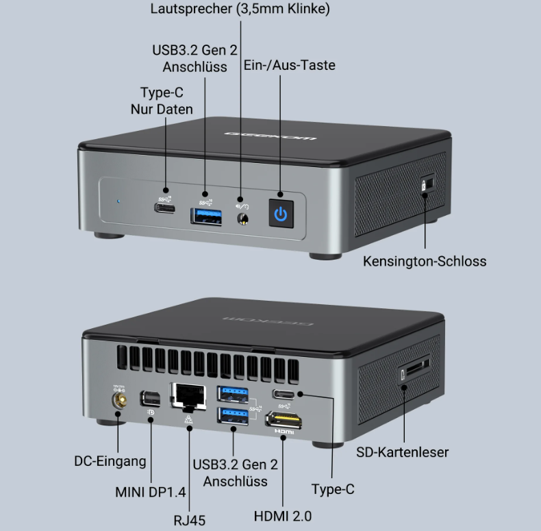 • Toimituksen sisältö: 1 x Mini PC, 1 x VESA-kiinnike, 1 x virtalähde